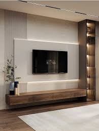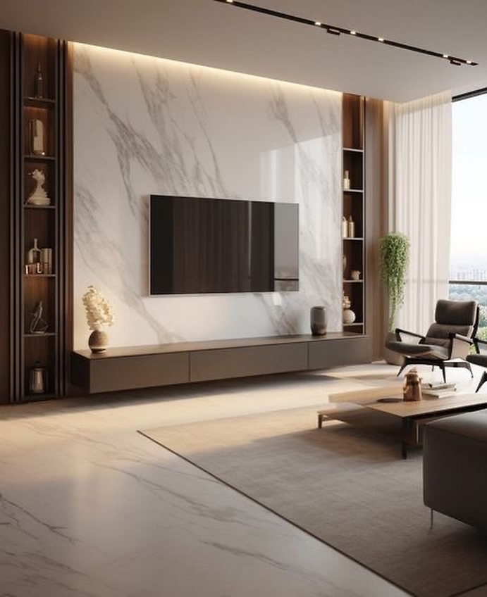 Feature TV walls with marble, wood, and fluted detailing.