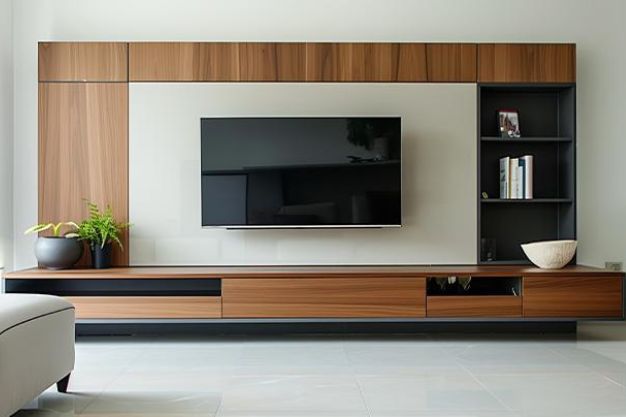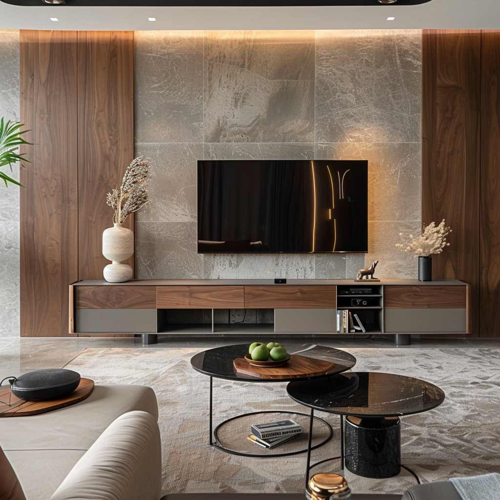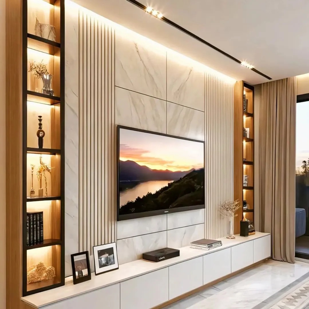 Feature TV walls with marble, wood, and fluted detailing.