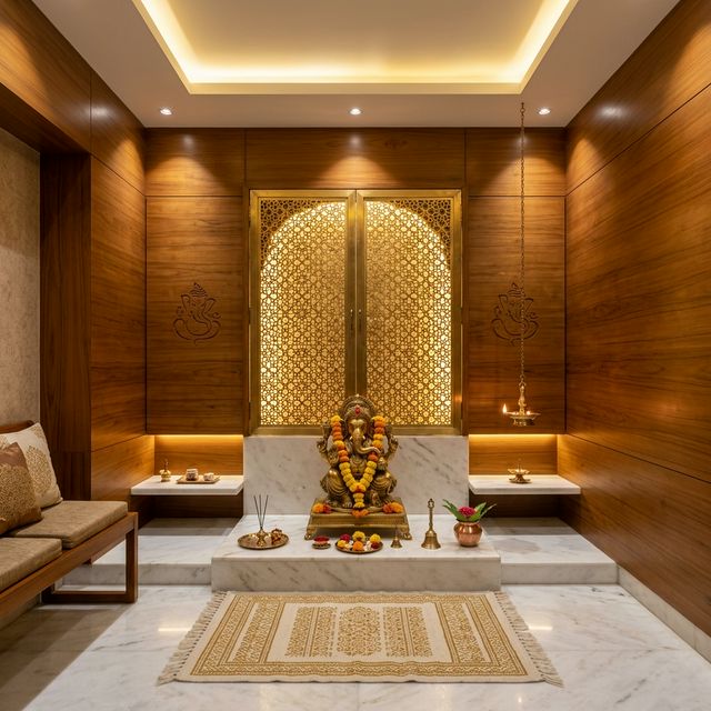 Calm, respectful sacred spaces with lighting, storage, and refined material accents.